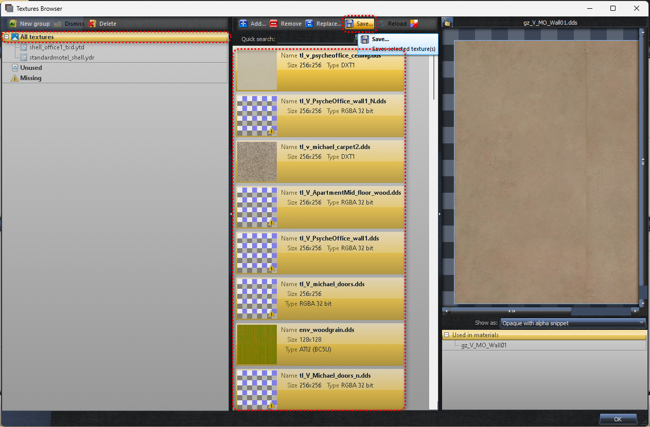 - Select all textures → Save → choose DDS format