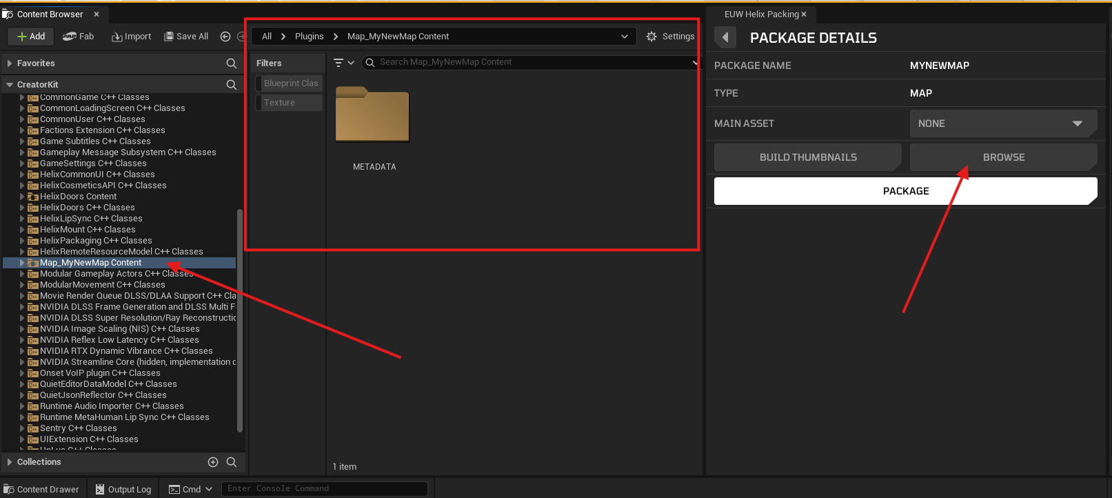 A single HELIX package can contain several assets of the same or different asset type (i.e. An "Addon" type package can contain blueprints, static meshes, materials, effects). However, if you select a specific package type upon creation such as Vehicle or Map, Creator Kit will only cook/package assets that are directly referenced by the selected "default asset". This may result in some of assets that are present in the Content Browser package folder to be missing from the packaged Pak file.