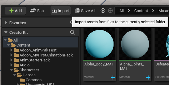 Create a temporary folder in Creator Kit project, and click Import in content browser to import your mixamo animation