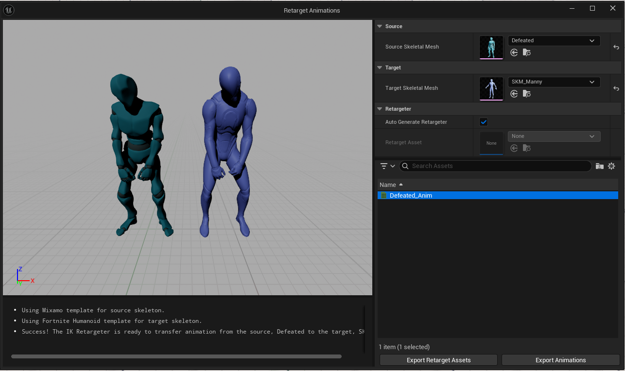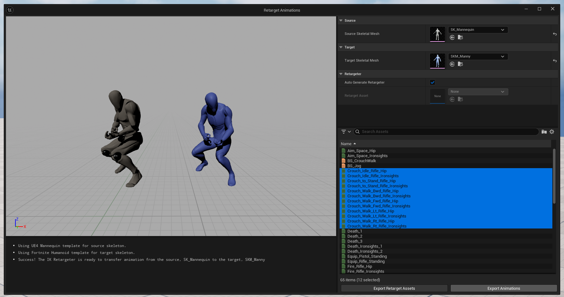 The engine will now process and retarget all selected animations, creating new copies in your package folder that are compatible with the HELIX skeleton.