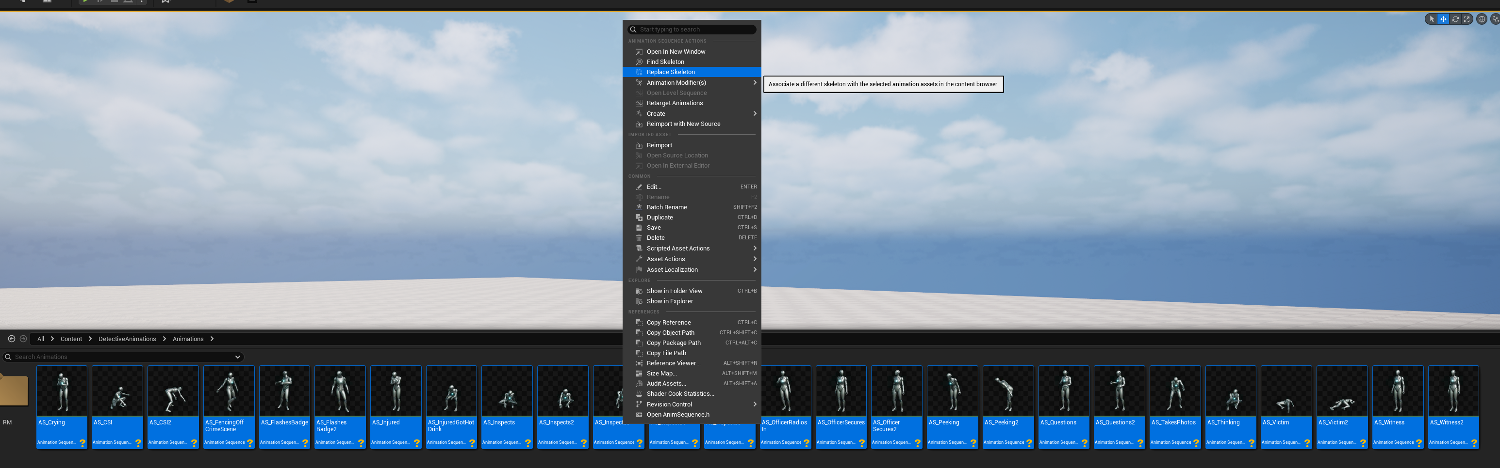 Verify that the selected animations now reference the SK_Unified skeleton. Save all modified assets (