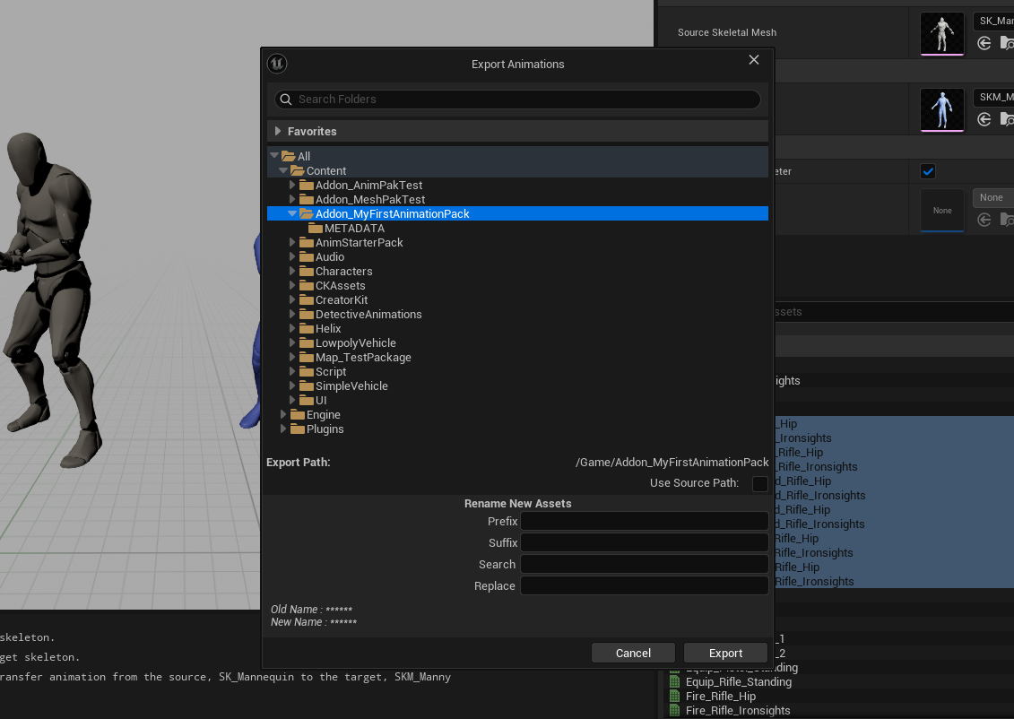In the Content Browser, move all the modified animation assets into your package folder (e.g., Content/Addon_MyFirstAnimationPack).