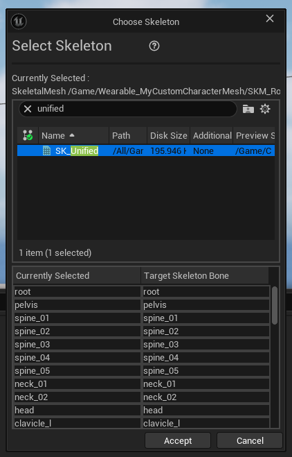 SK_Unifiedas target skeleton. This ensures your mesh is encoded with the project's main skeleton asset, making it compatible with HELIX character animations. -