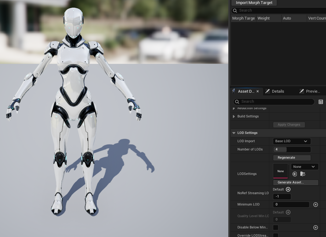 Next, open your skeletal mesh asset. Tweak any required parameters, and ensure you have LOD data generated for your mesh. This ensures your mesh does not negatively impact performance for distant characters wearing your clothing. You can set LOD count to 4 and click regenerate to automatically generate LODs for your mesh, as shown below.