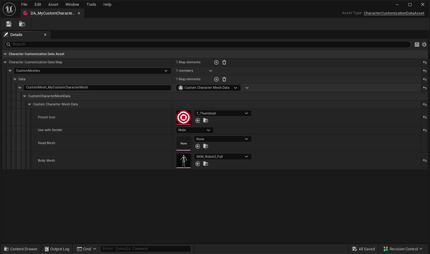 DA_MyCustomCharacterMeshand open. Click + button and choose the Custom Meshes type. -