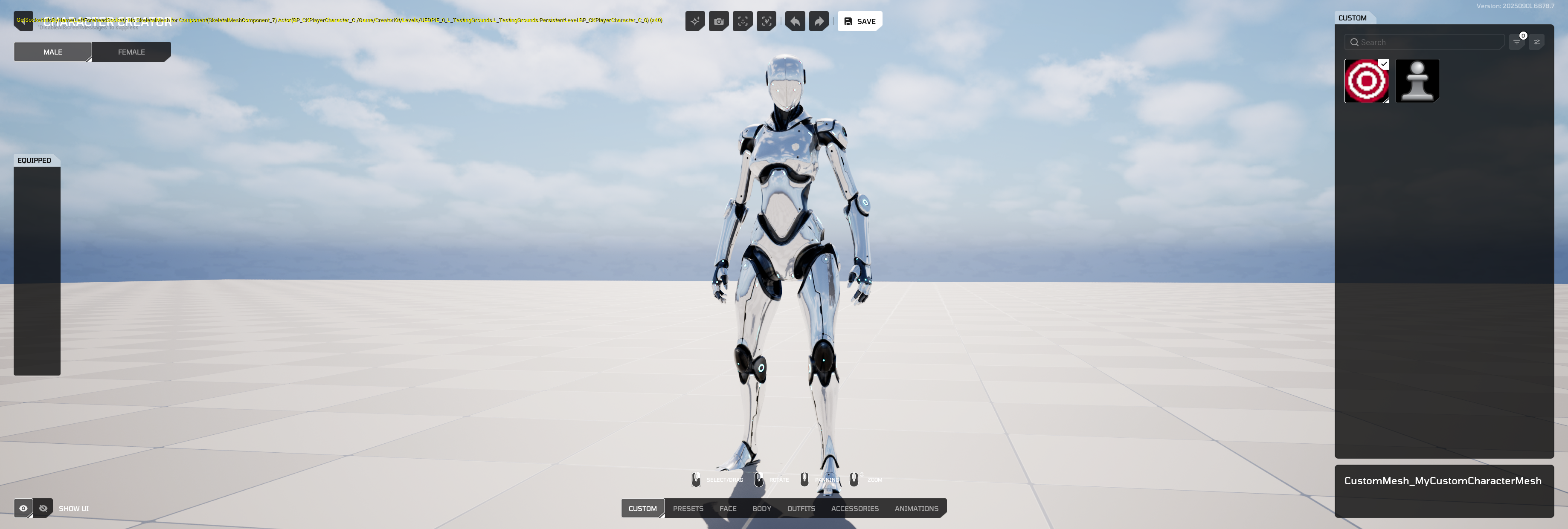 Fill the required parameters for your custom mesh. Usually, you should leave the Head Mesh field empty, and assign your full body custom mesh to Body Mesh field. Choose gender type for the one closest to your character mesh body proportions. This will ensure the correct invisible base mesh is used while playing animations for your custom mesh.
