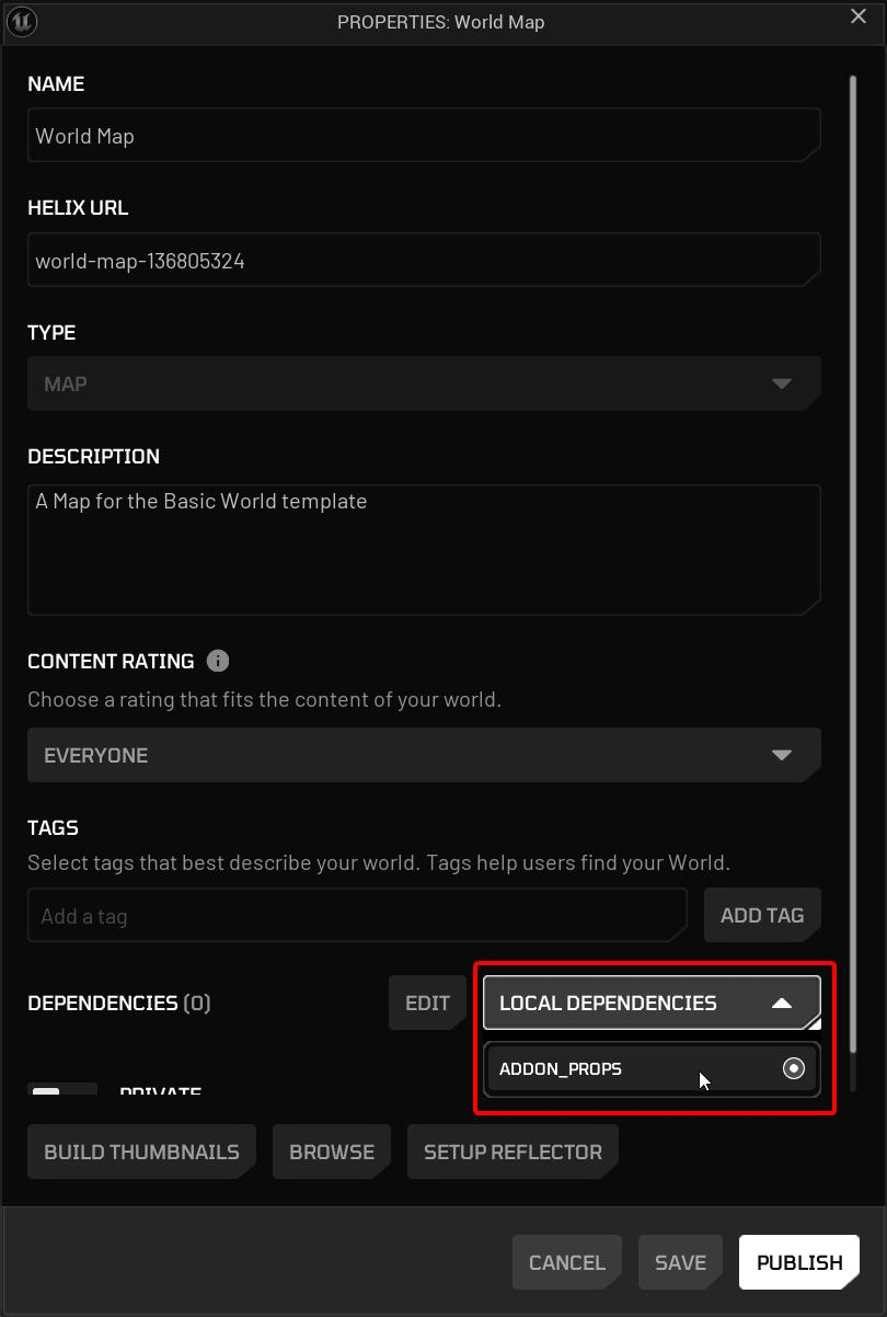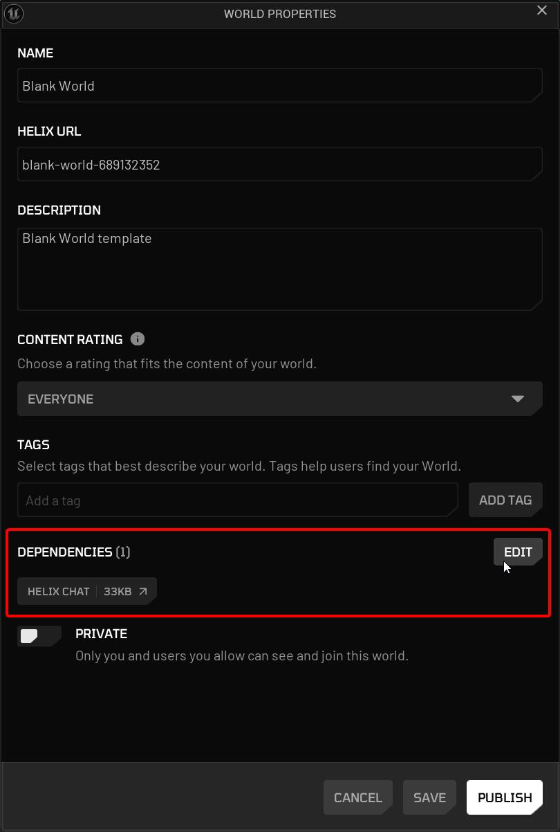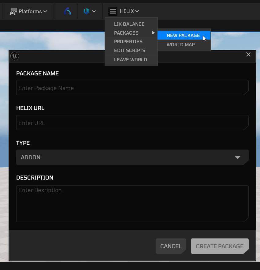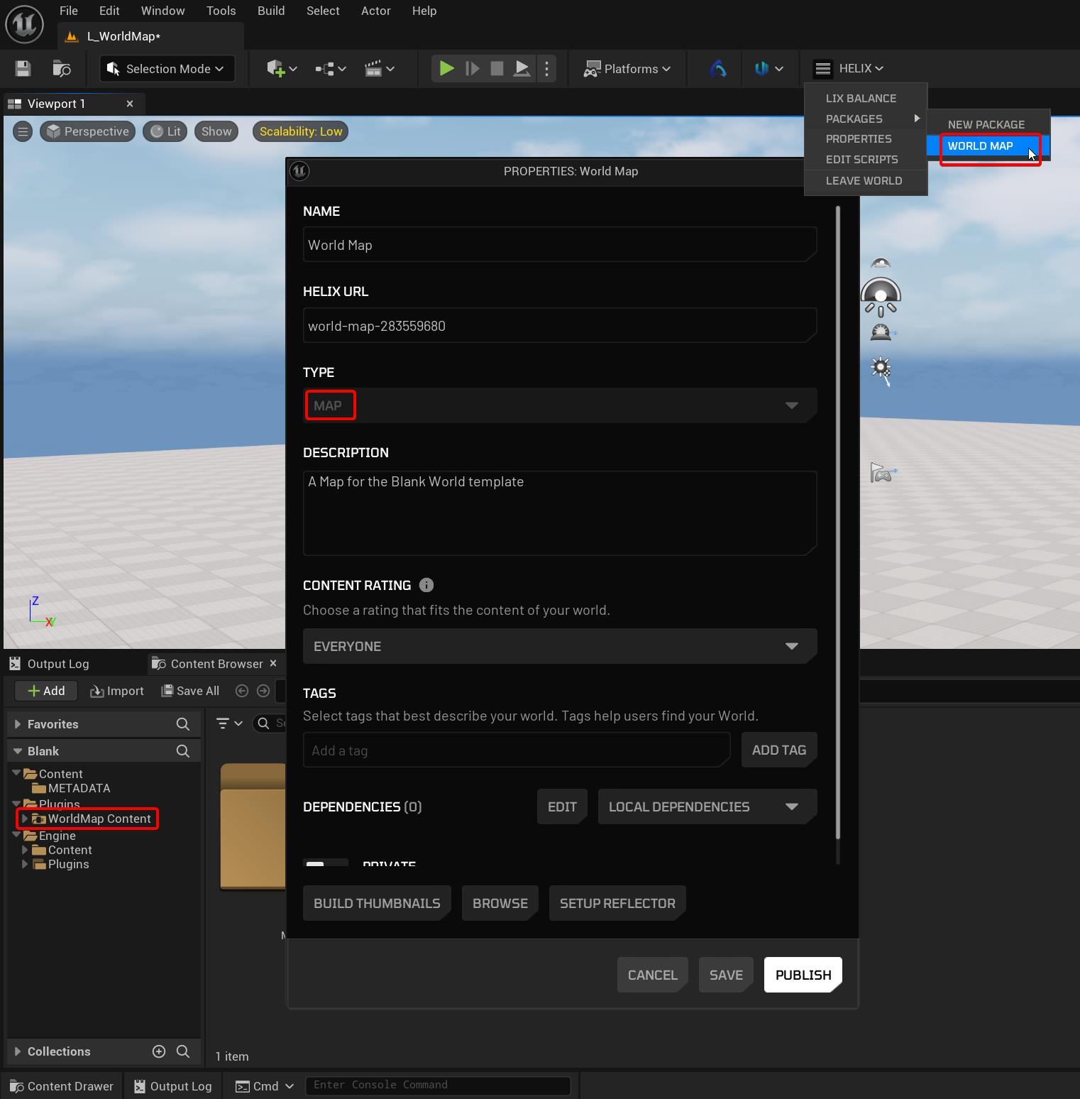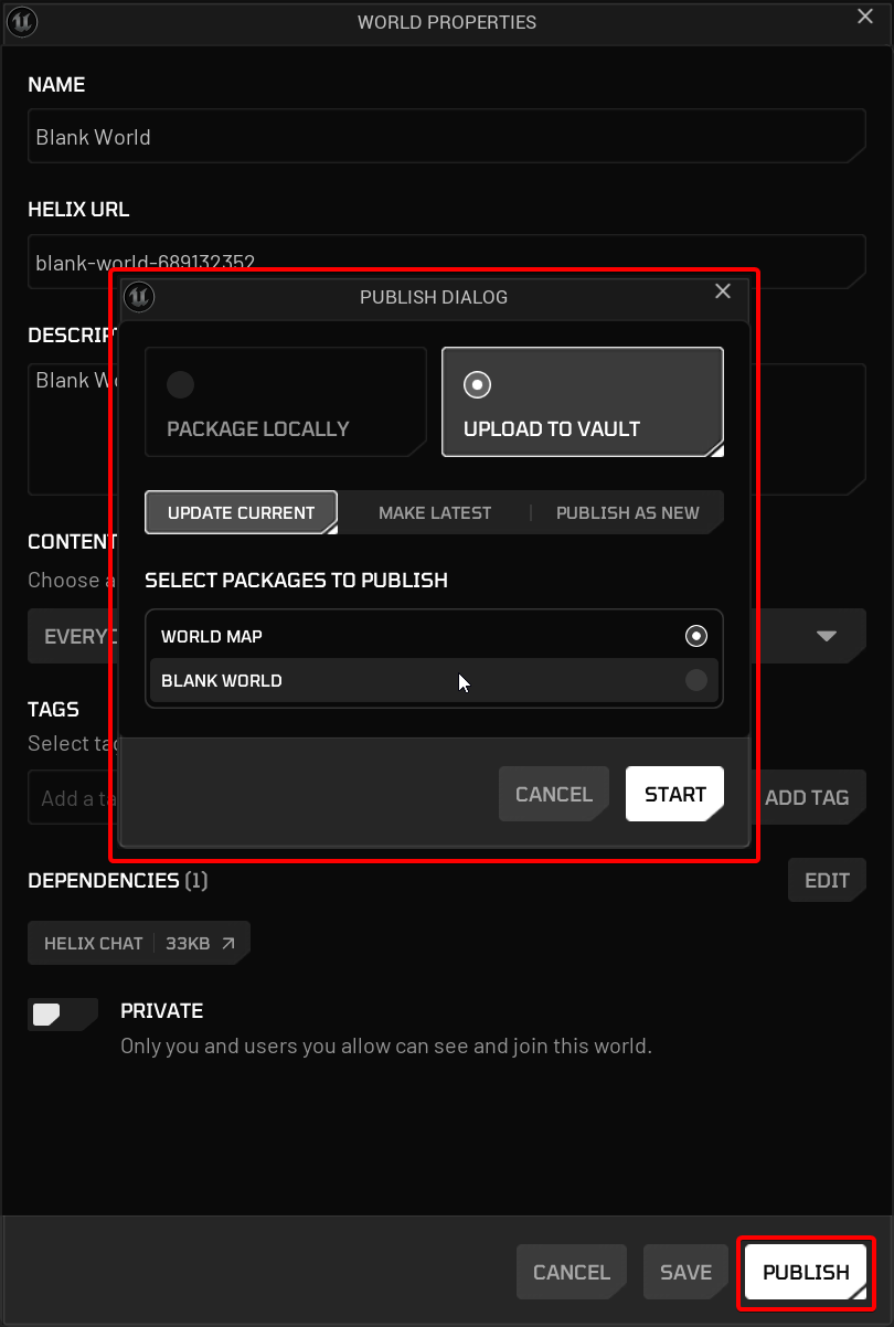 You can access Publishing options from the properties dialog of either the World or a package. You can publish to the Vault or create a PAK file locally for testing with the HELIX game client:
