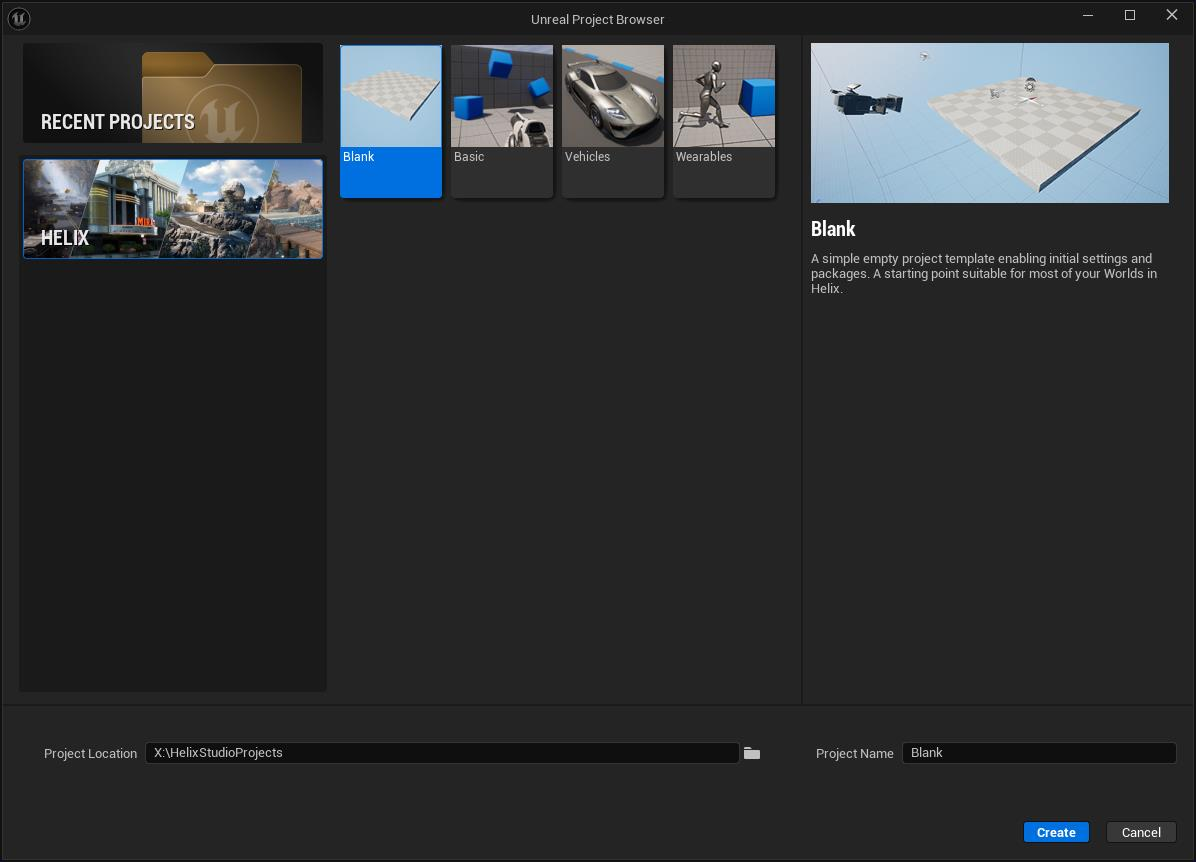After initialization, you will see the Project Browser window. Navigate to the HELIX section and select one of the project templates. For this tutorial, we will start with the Blank template: